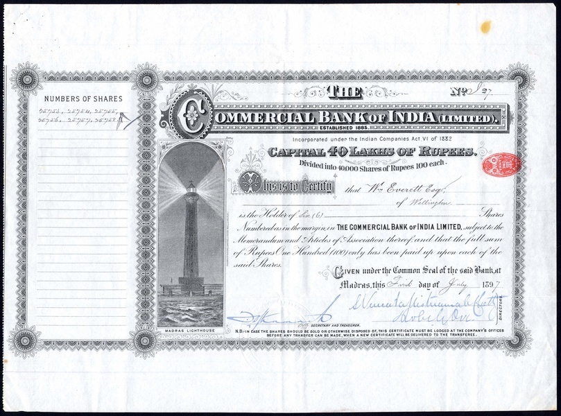 Commercial Bank of India Ltd., 100 rupee shares, Madras 189[7], no.J27, lovely vignette of the Madras Lighthouse, black, printed by Waterlow & Sons, small stain in top border, good very fine.