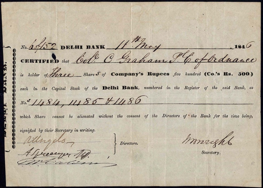 Delhi Bank, certificate for [3] shares of 500 Company rupees each, 184[6], no's 1484,1485 and 1486, small format, plain print, signed by 3 directors and the secretary, small hole in centre, about very fine and rare.