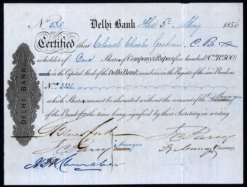 Delhi Bank, certificate for [1] share of 500 Company rupees, 185[6], no.538, scrollwork at left, black, signed by 3 managers and the secretary, very fine and rare.