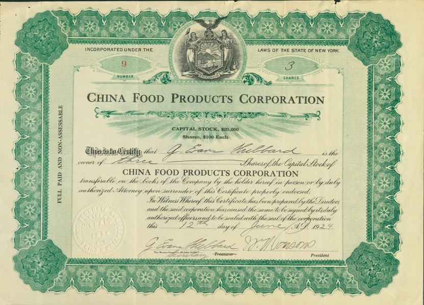 China Food Products Coporation, certificate for three $100 shares, 19[24], no.9, green, black, folds, pinholes, light creases, minor margin damages at upper margin, very fine.