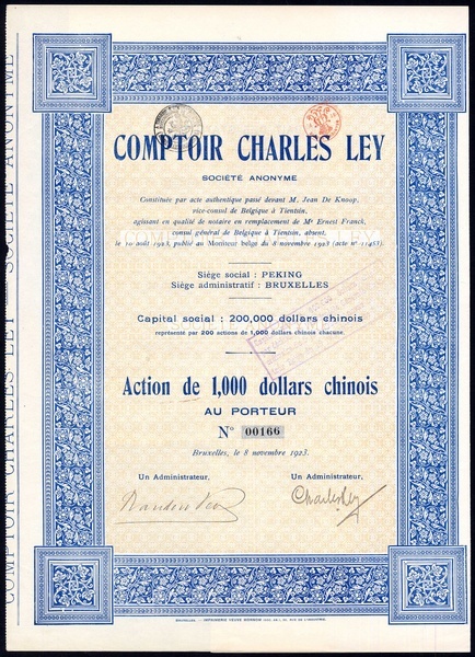 Comptoir Charles Ley S.A., bearer certificates for $1000 Chinese, Brussels 1923, no.166, of only 200 issued, ornate border, blue with yellow underprint, with coupons, extremely fine.