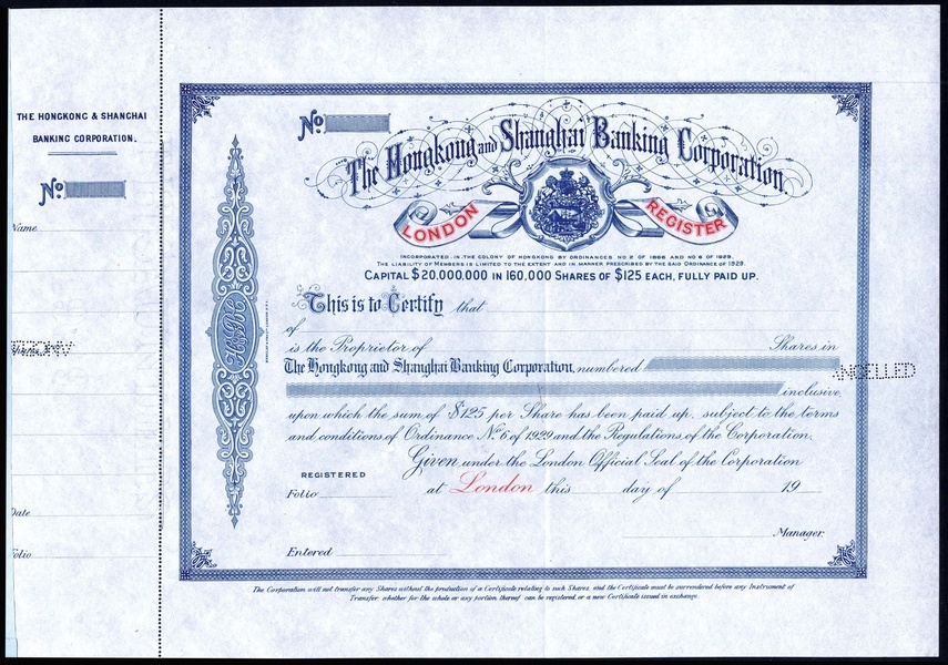 Hongkong and Shanghai Banking Corporation, an unissued certificate for $125 shares, London Register, 19- (circa 1929), arms in centre, blue and red, with counterfoil, extremely fine.