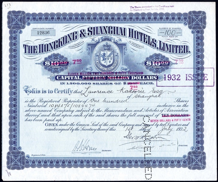 Hongkong and Shanghai Hotels Ltd., $7.50 shares, 193[2], no.12836, issued to Lawrence Kadoorie, ornate border, coat of arms in centre, blue, capital overprinted with reduced figures, printed by Waterlow & Sons, perforated cancelled, about extremely fine.