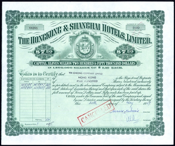 Hongkong and Shanghai Hotels Ltd., a group of certificates for $7.50 shares, 19[69], all signed by Horace Kadoorie as director, ornate border, coat of arms in centre, green, printed by De La Rue, cancelled, extremely fine. (12)