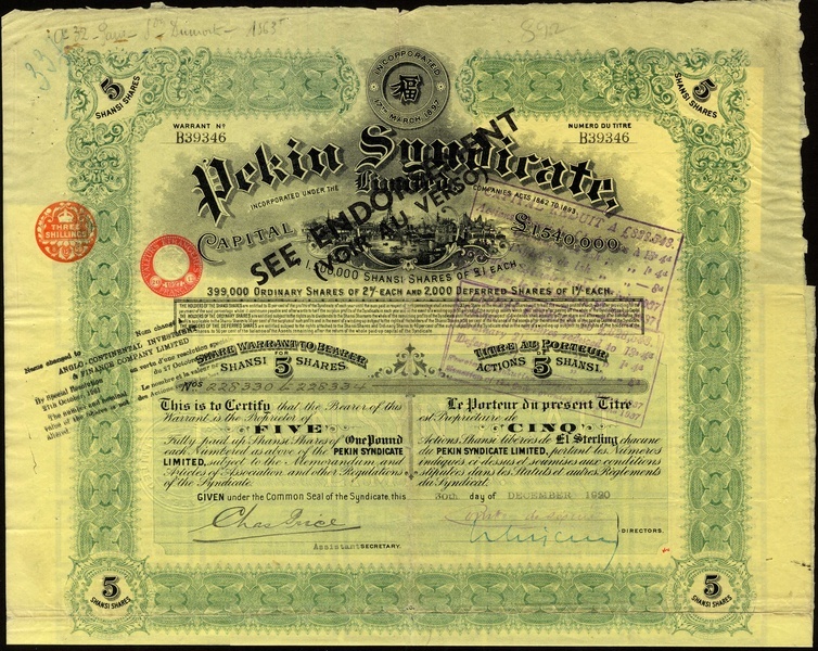 Pekin Syndicate Limited, bearer share certificate for 5 Shansi shares of 2/-, 19[10], ordinary share capital shown as 399,000 shares, vignettes of harbour scene flanked by steam train and mine, ornate border, green, yellow and black, with coupons, several endorsements on face, very fine