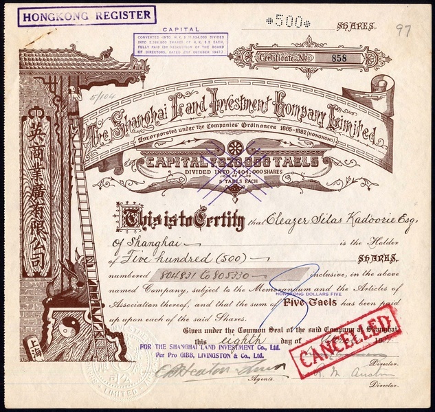 Shanghai Land Investment Company Ltd., a group of 4 certificates for 5 tael shares, fully paid, 19[31], issued to Eleazor Silas Kadoorie, full height vignette of Chinese workman on a ladder working on the roof of a building, brown, stamped cancelled, generally extremely fine. (4)