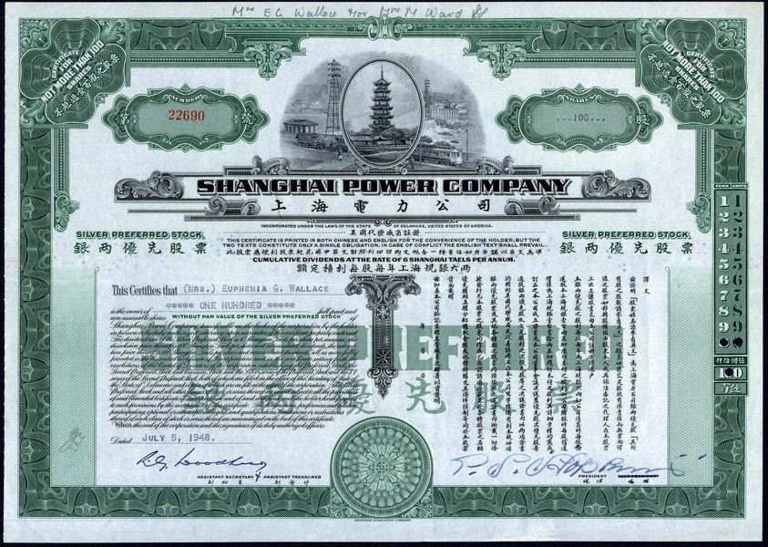 Shanghai Power Company, certificate for not more than 100 shares, silver preferred stock, [1948], no.22690, pagoda in centre flanked by electric tram and pylon, text in English and Chinese, green and black, NOT cancelled, extremely fine.