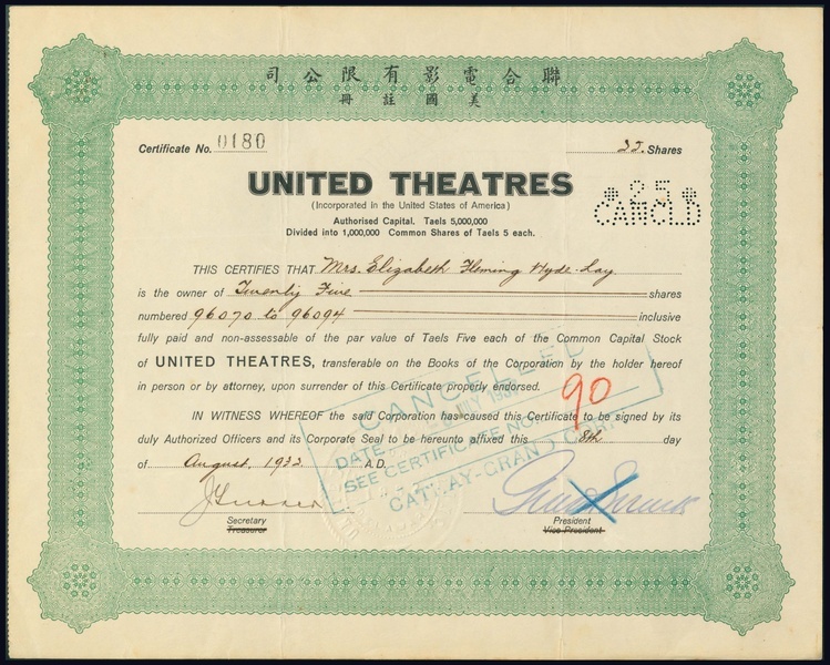 China: United Theatres, 5 tael shares, [1932], no.0180, ornate border, green and black, text in English with title in Chinese. One of the many Chinese companies allowed to incorporate under USA Federal law. Stamped cancelled, good very fine.