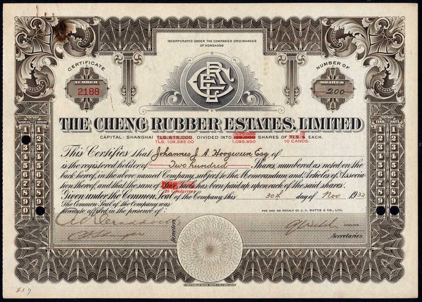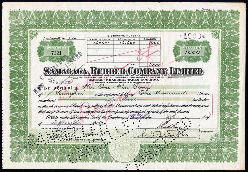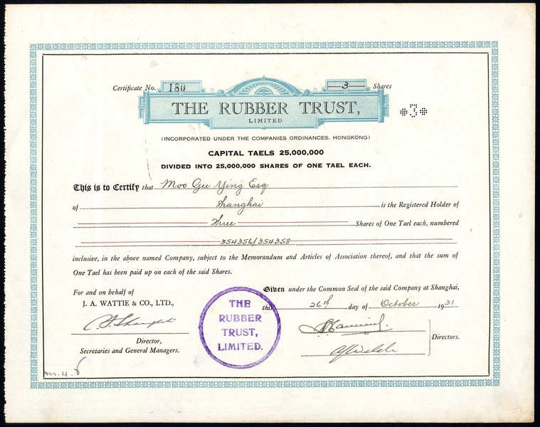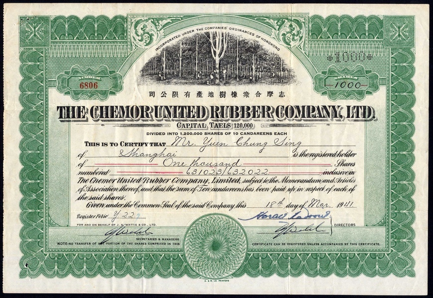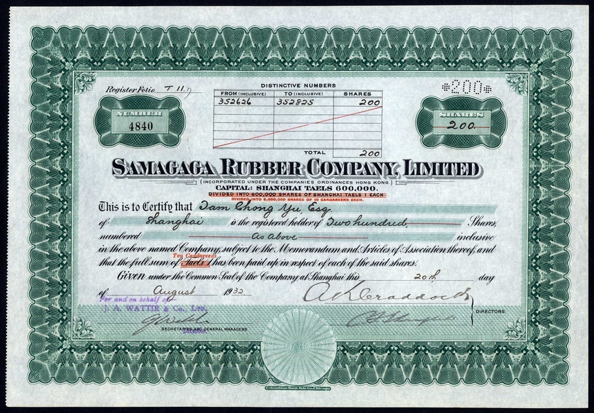 A group of Malayan Rubber companies registered in Hongkong and quoted in Shanghai, share denominations in taels and candareens, comprising Cheng Rubber Estates, 19[32], rust marks at top; Chemor United Rubber Co. Ltd., 19[41]; Samagaga Rubber Co. Ltd., 19[32] and another 19[47], 2 examples, these cancelled, and, The Rubber Trust Ltd., 19[31] and 19[41], 3 examples, very fine to extremely fine. (9)