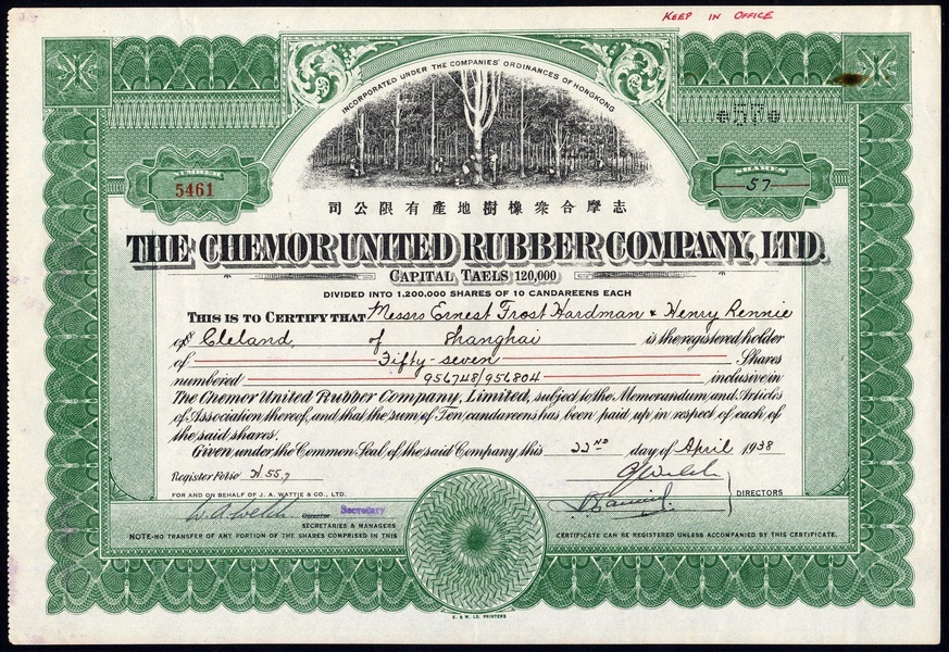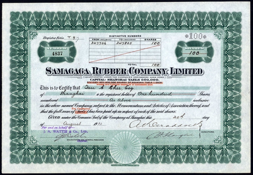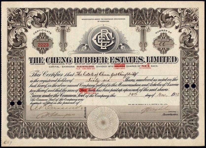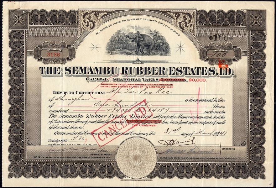 A small collection of Malayan Rubber companes, comprising Semambu Rubber Estates Ltd., 10 candareen shares, 192[41], no.3136, vignette of elephant, brown, cancelled; Chemor United Rubber Co. Ltd., 10 candareen share, 19[38], no.5461, vignette of plantation, green; Cheng Rubber Estates Ltd., 10 candareen shares, 19[32], no.2223, brown, capital overprinted in red, and, Samagaga Rubber Co. Ltd., 10 candareen shares, 19[32], no.4837, green capital overprinted in red, very fine to extremely fine (4)