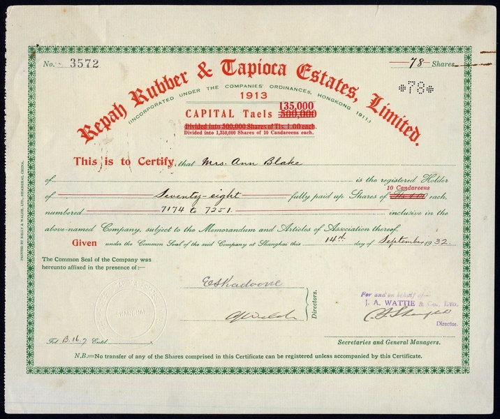 Repah Rubber & Tapioca Estates Limited, 10 candareen shares, 19[32], no.3572, signed by E.S.Kadoorie as director, red and green printing, capital overprinted reducing from 1 tael each, a couple of rust marks but otherwsie extremely fine and scarce.