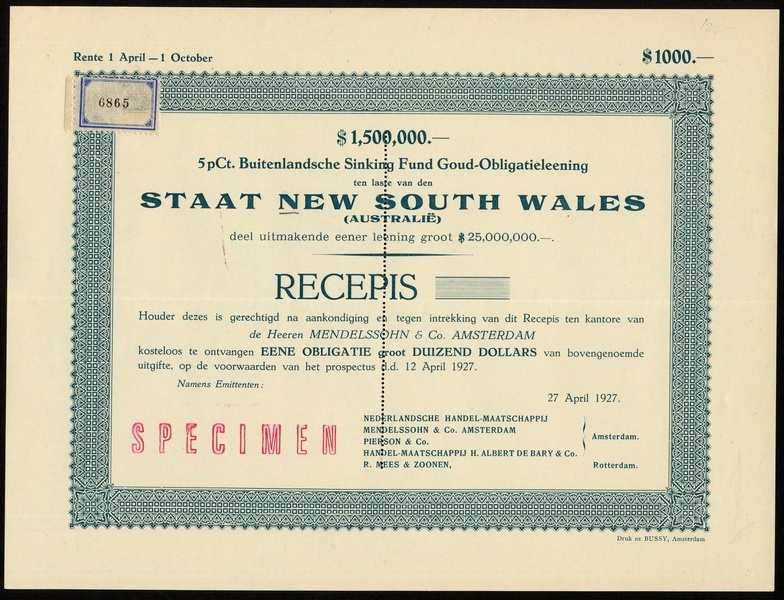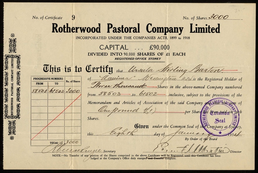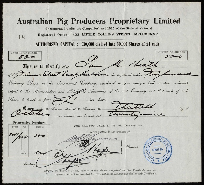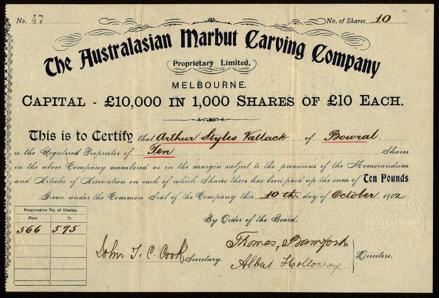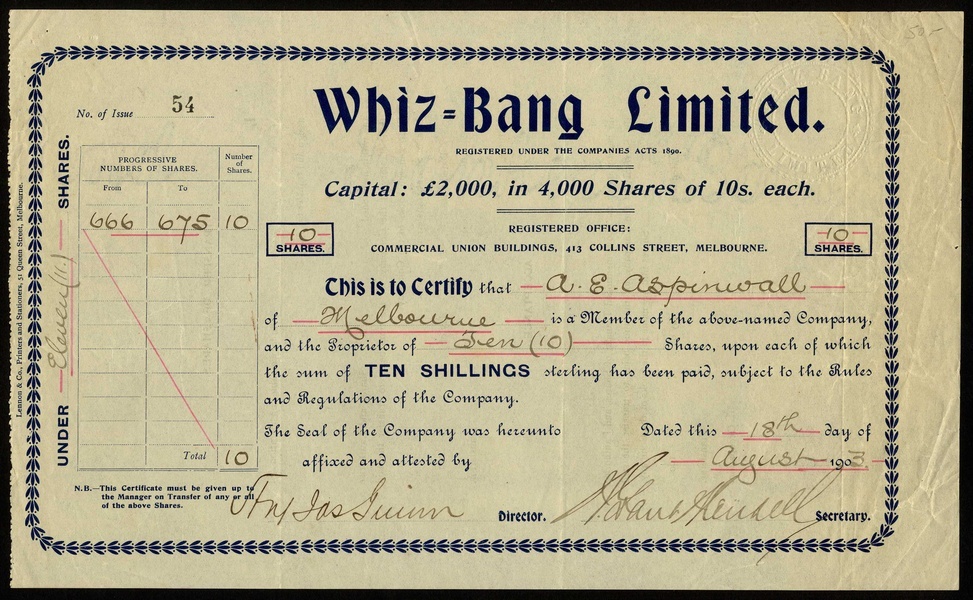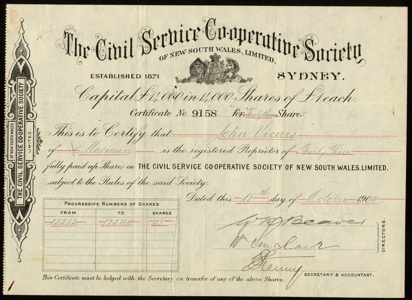 A group of Australian certificates, comprising Societe Franco-Australienne, Digeon & Cie., 1885, pink and black; Whiz-Bang Ltd., 190[3], tear; Australasian Marbut Carving Co. Prop. Ltd., 190[2]. Owned the rights to the Marles & Butt wood carving machine for Australasia; New South Wales State loan, specimen certificate for $1000 bond for trading in the Netherlands; Rotherwood Pastoral Co. Ltd., 193[4]; Civil Service Cooperative Society of NSW, 190[4]; Australian Pig Producers Proprietary Ltd., 19[29]; Commercial Bank of Australia Ltd., 19[18], and modern certificates (33), some duplication, generally very fine and better. (41)