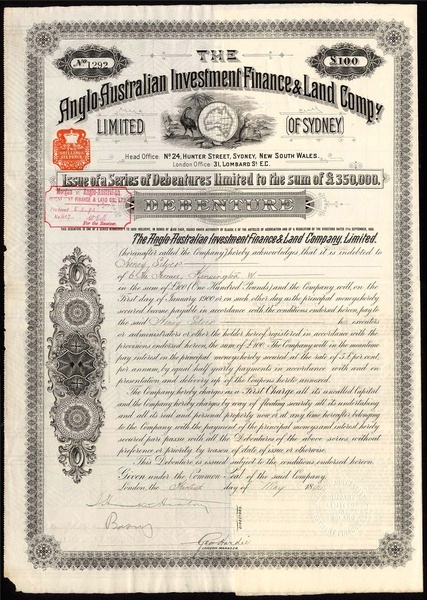 Anglo-Australian Investment Finance & Land Co. Ltd (of Sydney), £100 debenture, London 18[90], No.1292, vignette depicting a map of Australia surrounded by native figures and wildlife, scrollwork at left, decorative border, black, with coupons, small repaired tear on left edge, GVF.