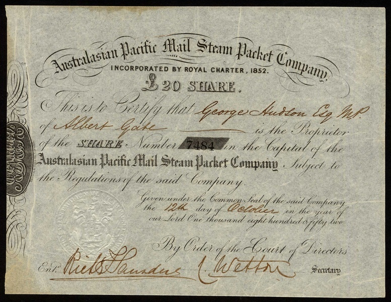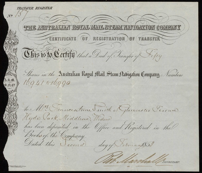 Australian Royal Mail Steam Navigation Co., transfer certificate for 50 shares, 185[3], No.157, black on blue paper, together with Australasian Pacific Mail Steam Packet Co., £20 share, 1852, No.7484, black, both VF. (2)