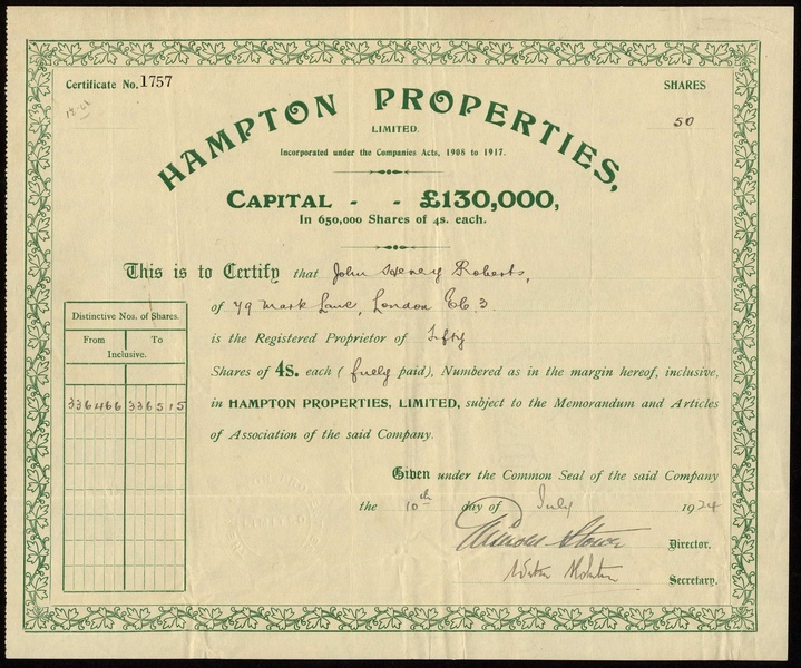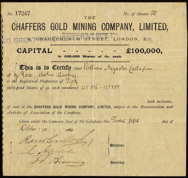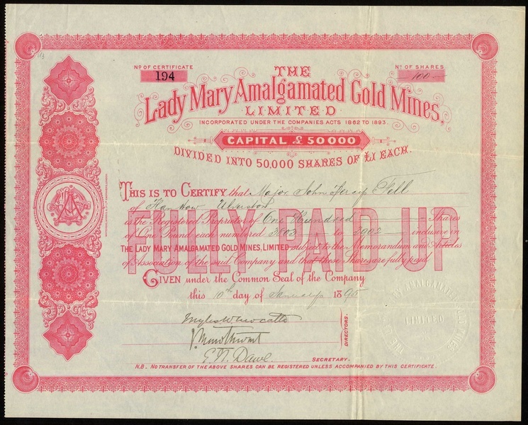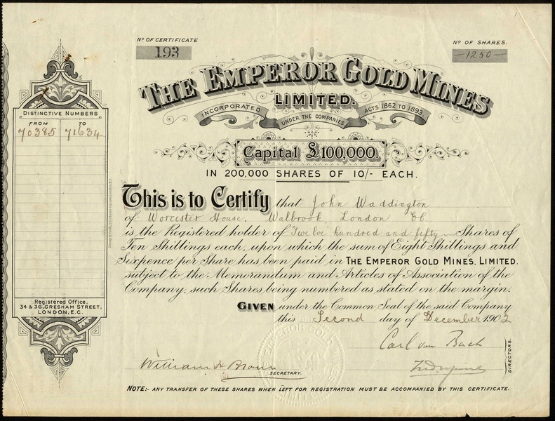 Western Australia: a small group of mining certificates comprising Lady Maty Amalgamated Gold Mines Ltd., £1 shares, 18[95], no.194, red and Emperor Gold Mines Ltd., 10/- shares, 190[2], no.193, black, both owning mines in the Murchison district; Chaffers Gold Mining Co. Ltd., 4/- shares, 189[900], no.17247, and, Hampton Properties Ltd., 4/- shares, 19[24], no.1757, generally very fine. (4)