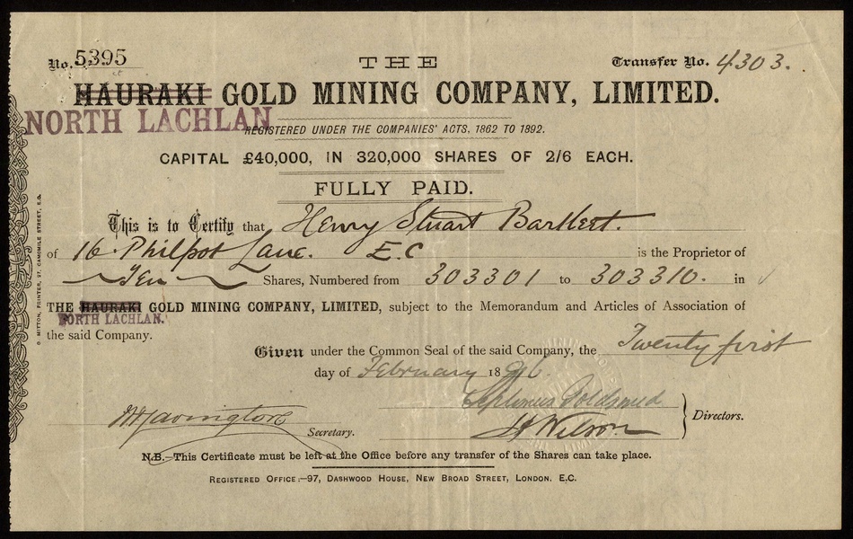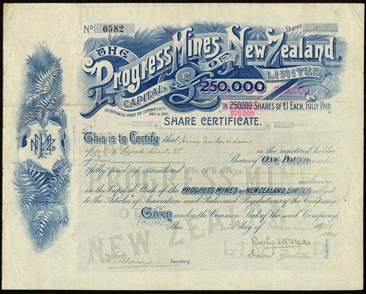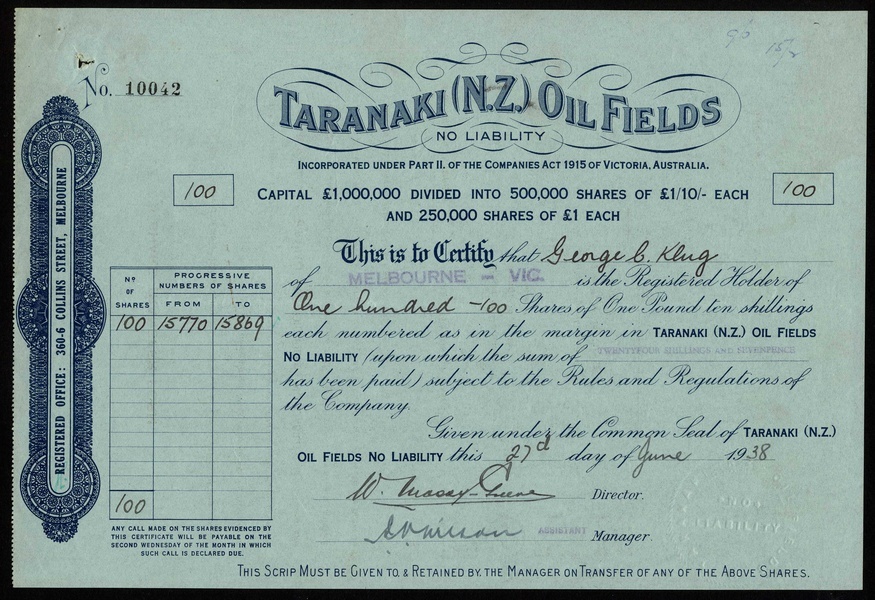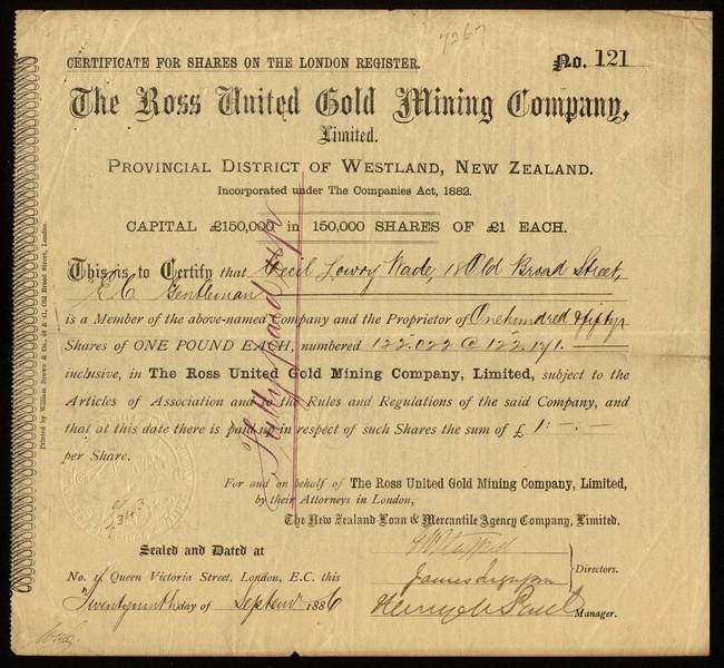 New Zealand: Ross United Gold Mining Co. Ltd., Provincial District of Westland, £1 shares, London 188[6], together with three more New Zealand based mining companies comprising North Lachlan Gold Mining Co. Ltd., 18[96]; Progress Mines of New Zealand Ltd., 1[901], and Taranaki (N.Z.) Oil Fields, 19[38], all VF. (4)