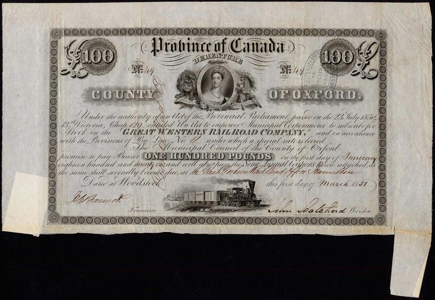 Province of Canada, Great Western Railroad Company, a bond for £100 issued by the County of Oxford in aid of the company, 18[51], no.49, lovely vignette of steam train and the young Queen Victoria above, black, ink cancelled on face, VF.