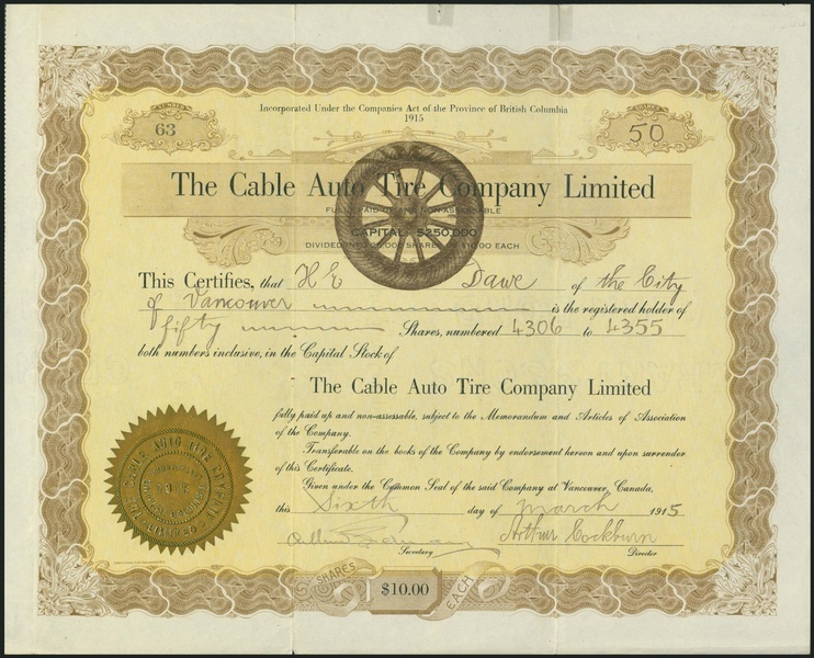 Canada: Cable Auto Tire Company, Limited, certificate for 50 $10 shares, Vancouver, 191[5], no.63, nice vignette of a tire, embossed seal, two minor tears repaired on reverse, very fine.