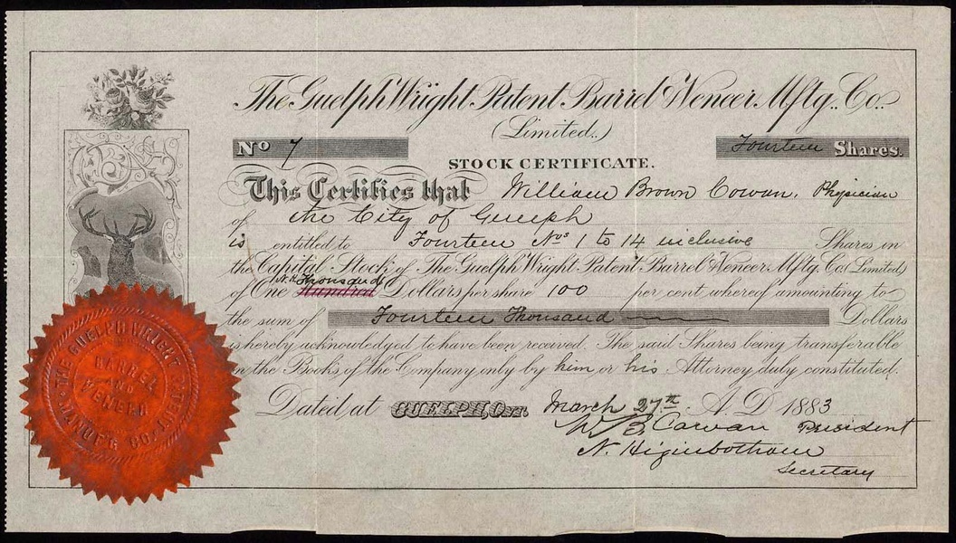 Canada: Guelph Wright Patent Barrel & Veneer Manufacturing Co. Ltd., certificate of capital stock, Guelph, Ontario 188[3], no.7, vignette of deer to left, paper seal, good very fine and rare early Canadian registered company.