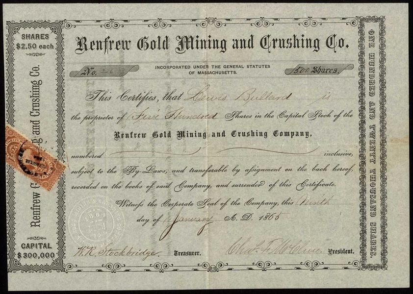 CANADA: Renfrew Gold Mining and Crushing Co. (MA), $2.50 shares, 186(5), black, adhesive revenue stamp. Mines in the Renfrew District of Nova Scotia but incorporated in Massachusetts. Very fine and scarce early piece.