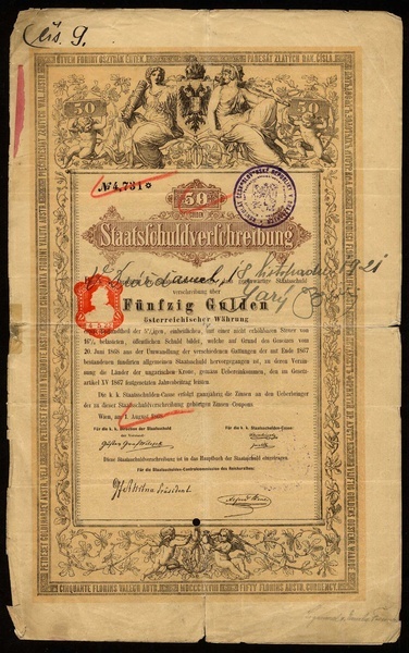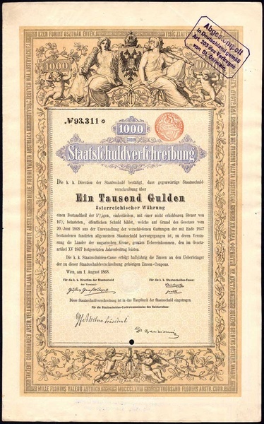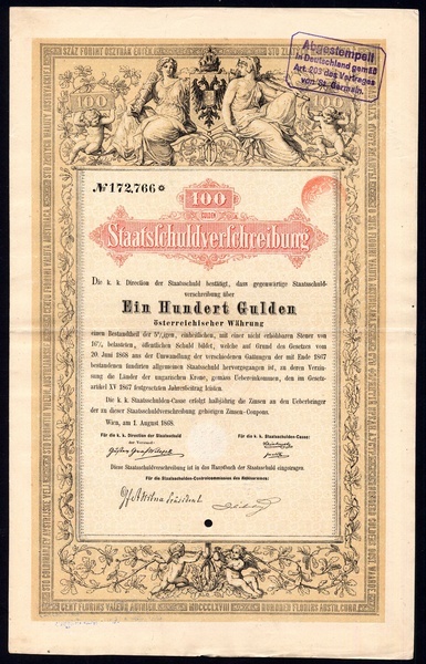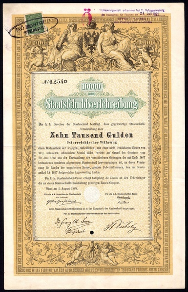 Direction der Staatsschuld, a group of 280 comprising Staatsschuldverschreibung, 10000 Gulden, Wien 1. August 1868, (2); 1000 Gulden, (122); 100 Gulden, (152); 50 Gulden, (4); generally VF. (280 items)