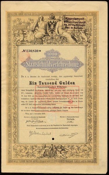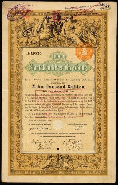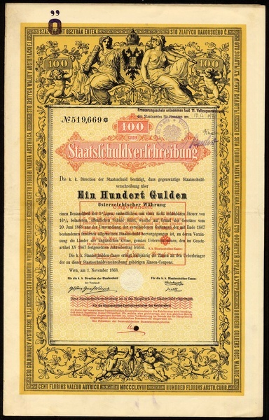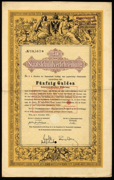 Direction der Staatsschuld, a group of 1758 comprising Staatsschuldverschreibung, 10000 Gulden, Wien 1. November 1868, (16); 1000 Gulden, (1076); 100 Gulden, (651); 50 Gulden, (15); generally VF. (1758 items) [Some of the items are still located in Berlin]