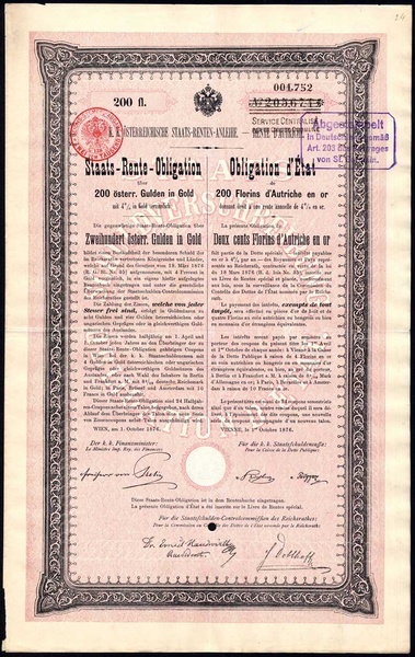 This Gold-Annuity-Loan was issued for the financing of the occupation of Bosnia-Herzegovina and to finance state participation into several railway projects.