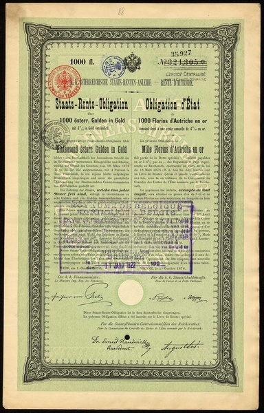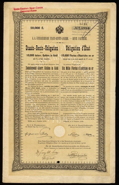 Staats-Rente-Obligation - 1876, a group of 31002 comprising 4% Obligation, 10000 Gulden in Gold, Wien 1. Oktober 1876, (36); 1000 Gulden in Gold, (13000); 200 Gulden in Gold, (17966); generally VF. (31002 items) [Some of the items are still located in Berlin]