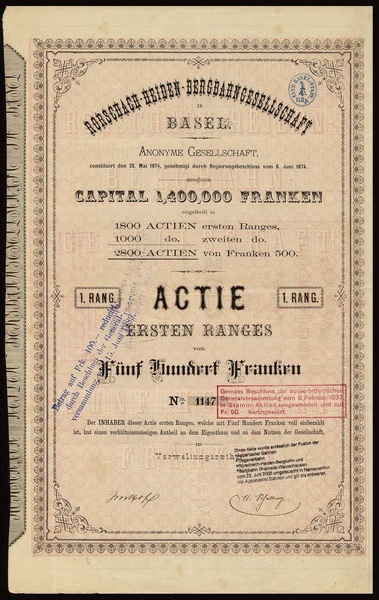 (x) Rorschach-Heiden-Bergbahngesellschaft, Aktie 1. Rang über 500 Franken, Basel, 6. Juni 1874, #1147, Auflage 1'800 Stück, Gründerstück, der Nominalwert wurde am 15. Juni 1889 auf 400 Franken reduziert und am 8. Februar 1937 wurde der Titel in eine Stammaktie mit 50 Franken Nennwert gewandelt, EF