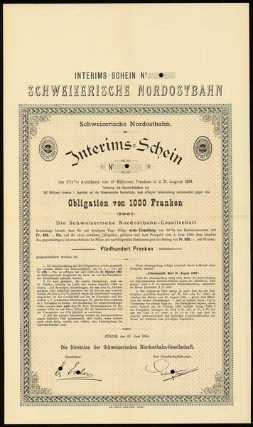 (x) Schweizerische Nordostbahn-Gesellschaft, Interims-Schein für eine Obligation über 1'000 Franken, Zürich, 30. Juni 1894, Blankett, Faksimile-Unterschriften, u.a. E. Escher, EF