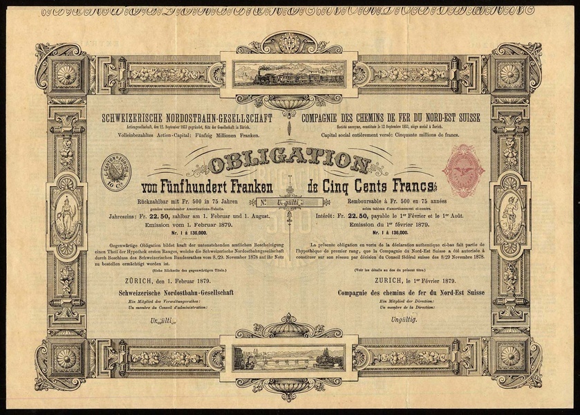 (x) Schweizerische Nordostbahn-Gesellschaft, Obligation über 500 Franken, Zürich, 1. Februar 1879, blaugrün, frühes und sehr dekoratives Papier dieser Gesellschaft, selten, EF