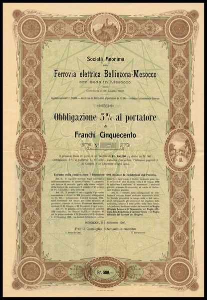 (x) Società Anonima della Ferrovia Elettrica Bellinzona-Mesocco, 5% Obligation über 500 Franken, Mesocco, 7. September 1907, Blankett, EF