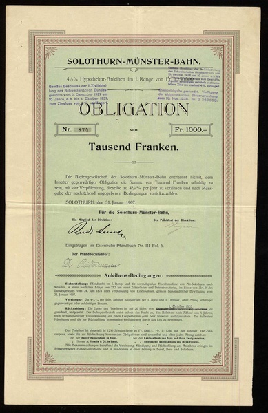 (x) Solothurn-Münster-Bahn, 4.5% Obligation über 1'000 Franken, Solothurn, 31. Januar 1907, #874, VF