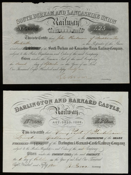 South Durham and Lancashire Union Railway, £25 share, 18[61], no.14996, together with Darlington and Barnard Castle Railway, £20 shares (5), all 185[4], nos.1697, 1683, 1516, 1517 and 1686, all black, all good very fine. (6)