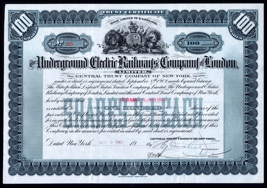 Underground Electric Railways Company of London Ltd., Trust certificate for 100 shares of £1 each, 19[09], no.205, British coat of arms at top, ornate border, blue, printed by American Bank Note Co., good very fine.