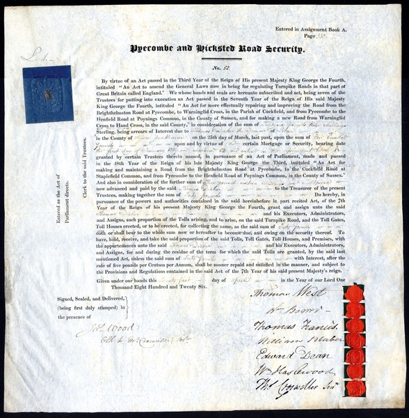 Pyecombe & Hicksted Turnpike Road, a loan document for £[40], 1826, no.53, entitling the holder to interest and a share in all tolls and property, signed by 7 trustees including Thomas West and Wiliam Borrer, bankers in Brighton, large format, black printing, on vellum, blue paper revenue stamps, very fine and rare. [R9]