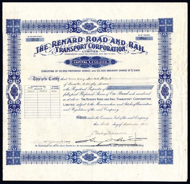 Renard Road and Rail Transport Corporation Ltd., £1 preferred shares, 19[07], no.293, very large format piece with ornate borders, blue, VF.