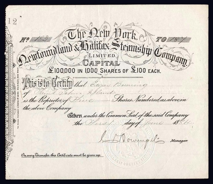 New York, Newfoundland & Halifax Steamship Co. Ltd., certificate for £100 shares, 18[84], no.183-187, decorative title, black printing, good very fine.