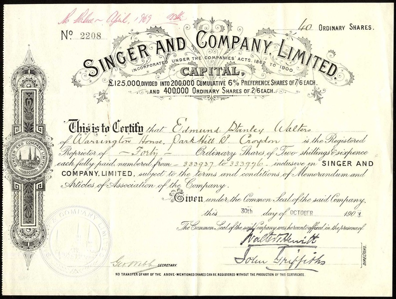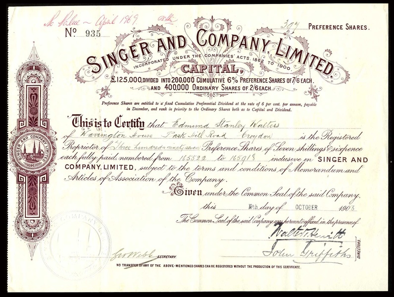 Singer and Co. Ltd., preference shares, no.935, 190[3], mauve, and ordinary shares, no.2208, 190[3], black, company logo in scrollwork at left, both very fine. (2)