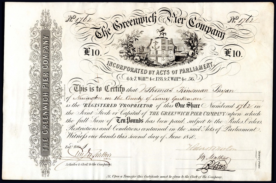 Greenwich Pier Company, £10 share, 1840, no.1762, very attractive piece with vignette of coat of arms with shipping in background, scrollwork at left, black on thick paper, tear at top edge (25mm) otherwise about extremely fine. [R9]