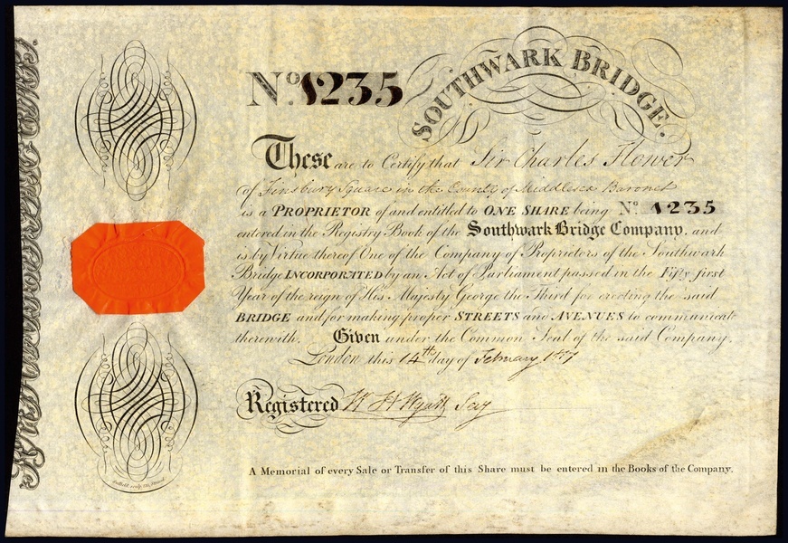 Southwark Bridge Company, certificate for one share, [1817], no.1235, orange paper seal at left, black printing on vellum. Built by John Rennie from cast iron, spanning 240 feet, joining London to Blackfriars. It was the largest bridge ever constructed of cast iron and it bankrupted the iron founders - Walkers of Rotherham. Replaced between 1912 and 1921 by the present bridge. Slight toning otherwise good very fine and scarce. [R9]