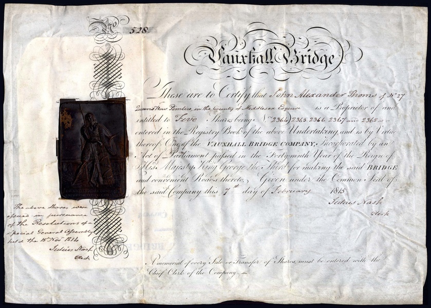 Vauxhall Bridge, certificate for [five] shares, 181[5], no.528, attractive piece with very unusual copper seal at left, black, on vellum. Designed by James Walker and opened in 1816, this was the first iron bridge over the Thames. It lasted less than 90 years and was demolished in 1898. Clean and bright in very fine condition.