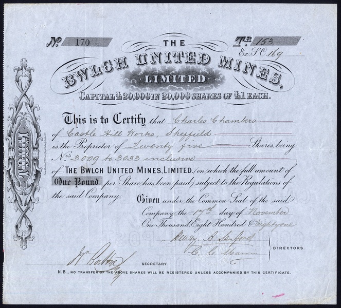 Bwlch United Mines Ltd., a group of 9 certificates for £1 shares, 18[81], scrollwork left, black, with a few odd related receipts. Lead mine in Cardiganshire. 7 are very fine, one with small tears, fine and the last poor with large piece missing. (9)
