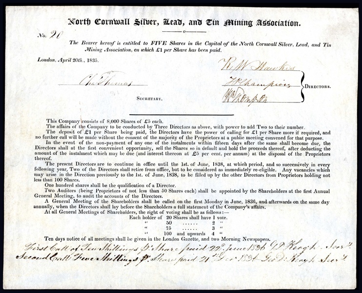 North Cornwall Silver, Lead, and Tin Mining Association, 5 shares of £5, £1 paid, London 1835, no.20, black printing, on vellum, rules printed on the face, manuscript endorsements of calls paid, near extremely fine. [R9]