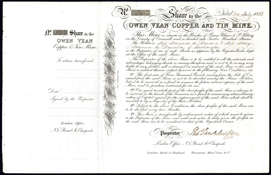Owen Vean Copper & Tin Mine, Mounts Bay, Cornwall, certificate for one share, 183[8], no.807, attractive black printing on thick paper, couple of edge tears at top otherwise good very fine and scarce. [R9]