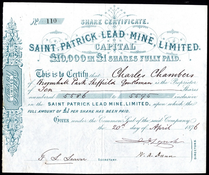 Saint Patrick Lead Mine Ltd., a group of 4 certificates for £1 shares, 187[6], no.110, 187[7], numbers 163 and 189, 187[8], no.209, scrollwork at left, blue-green, with related letters, very fine and better. (4)