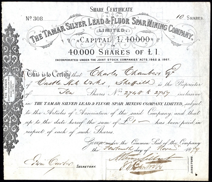 Tamar Silver Lead & Flour Spar Mining Co. Ltd., a group of 3 certificates for £1 shares, 18[79], no.308, 18[80], no.308 and 18- (undated in error), no.1130, scrollwork at left, black, with related letters, about very fine. (3)
