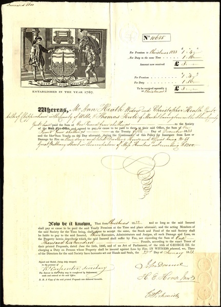Bath Fire Office, fire insurance policy and related paperwork, no.10685, 18[22], on dwelling house in the City, large format, vignette at top left, black printing on thick paper, good very fine.
