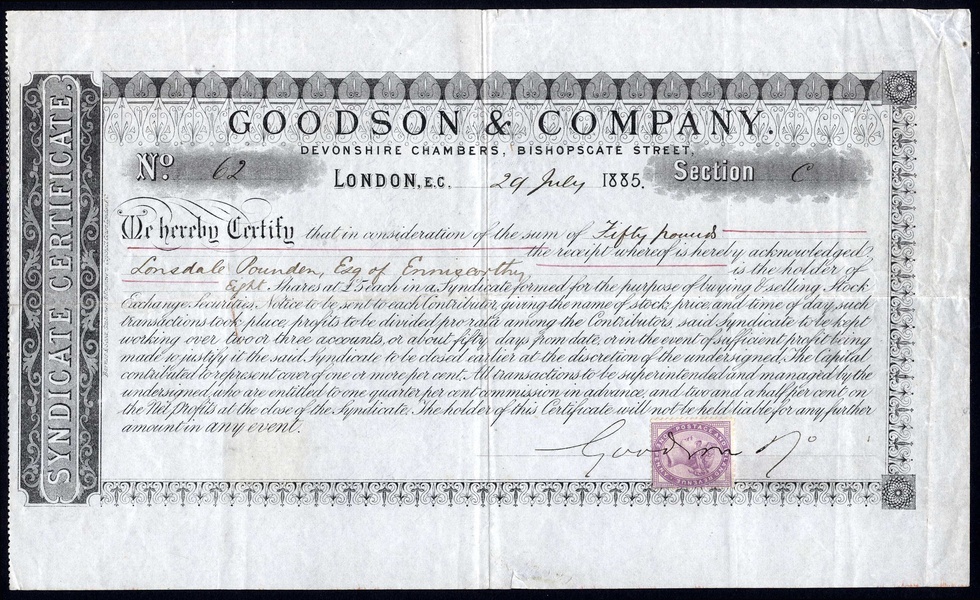 Goodson & Co., £5 shares in the syndicate, formed to buy and sell Stock Exchange securities, London 1885, no.62, ornate border, black, adhesive revenue stamp, very fine and rare.