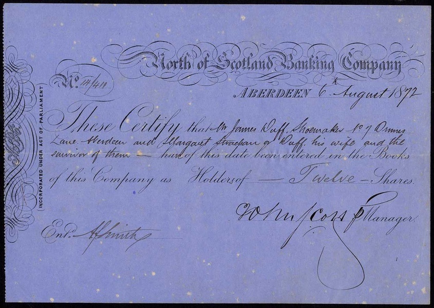 North of Scotland Banking Company, certificate of shares, Aberdeen 18[72], no.14/411, signed by the manager, black printing on blue paper. The bank was founded in 1836 and through amalgamation is now part of Clydesdale Bank. Scottish certificates have the appearance of being a cross between a true share certificate and a transfer certificate but this was the only document a shareholder received and they are extremely rare. Some spotting but very fine.